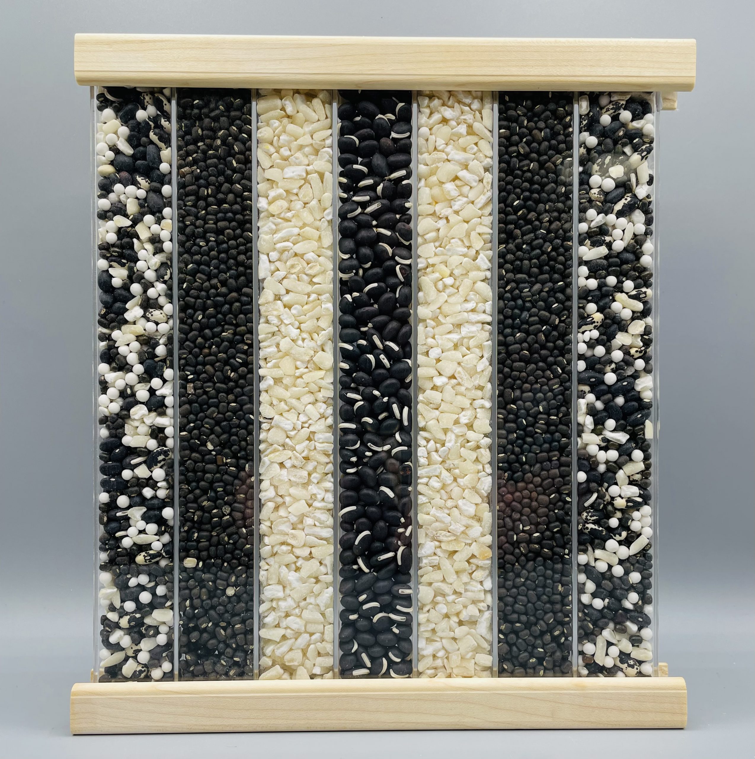 A stylish combination of various black, white and black/ white beans and grains. The wood rails are in light maple wood. Below are examples of our black and white plates. We will send our most popular design to fill your order from our inventory.